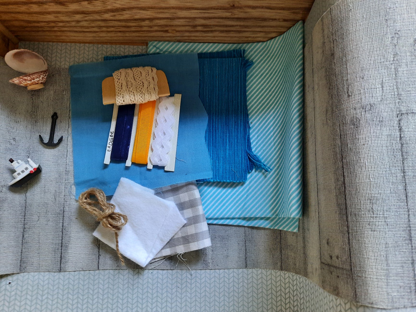 De volgende stap is om op zoek te gaan naar materialen geschikt met zo’n nautisch thema. Action heeft ook erg mooie scrap/knutselboeken met diverse thema’s, kleuren. Dit voor een vloer, behang. Of informeer eens bij een interieurwinkel in de buurt waar men ook behang verkoopt of er misschien stalenboeken over zijn. Kijk eens in een stoffenzaak naar lapjes, een winkel als Kwantum verkoopt gordijnstoffen per meter maar ook per 20 cm. Misschien zit er iets bij? Blauw-witte streepjes doen het altijd goed. Maar ook beige en hout zijn welgeziene gasten in omgevingen als dat. En vergeet niet een contrastkleurtje om de boel niet te monotoon te maken.
